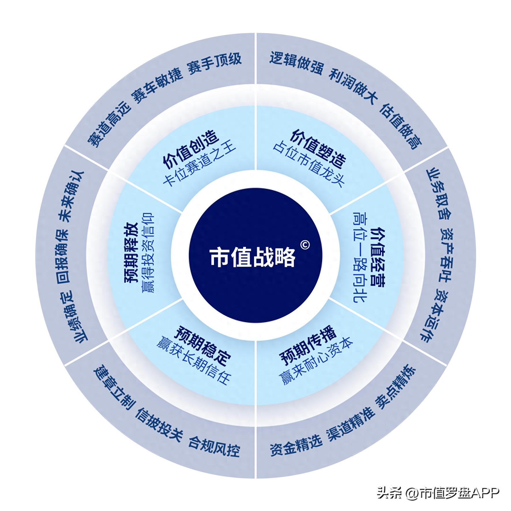 “做价值”的第二个方面是价值塑造。它是站在资本市场投资人的视角,塑造上市公司的投资价值标签。只有站在资本市场投资人的视角,赢得大家的认可,公司才有可能让资金从观望到买入再到长期持有、持续加码,最终推高公司市值。“做市值“的理想状态是占位市值龙头。那么,如何增强企业在投资人心中的投资价值标签,从而占位市值龙头呢?同样有三招: