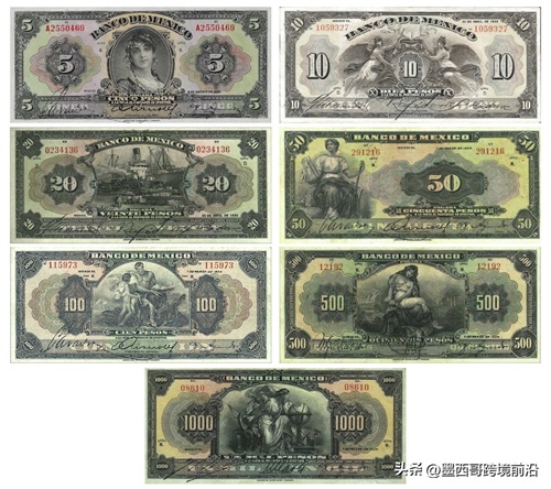 第 一批墨西哥央行纸币由美国纸币公司在纽约印制,尺寸为180 x 83 毫米。这个系列包括5、10、20、50、100、500和1000比索的纸币。