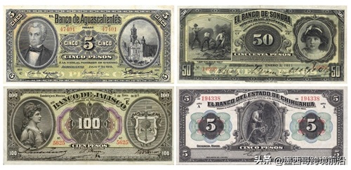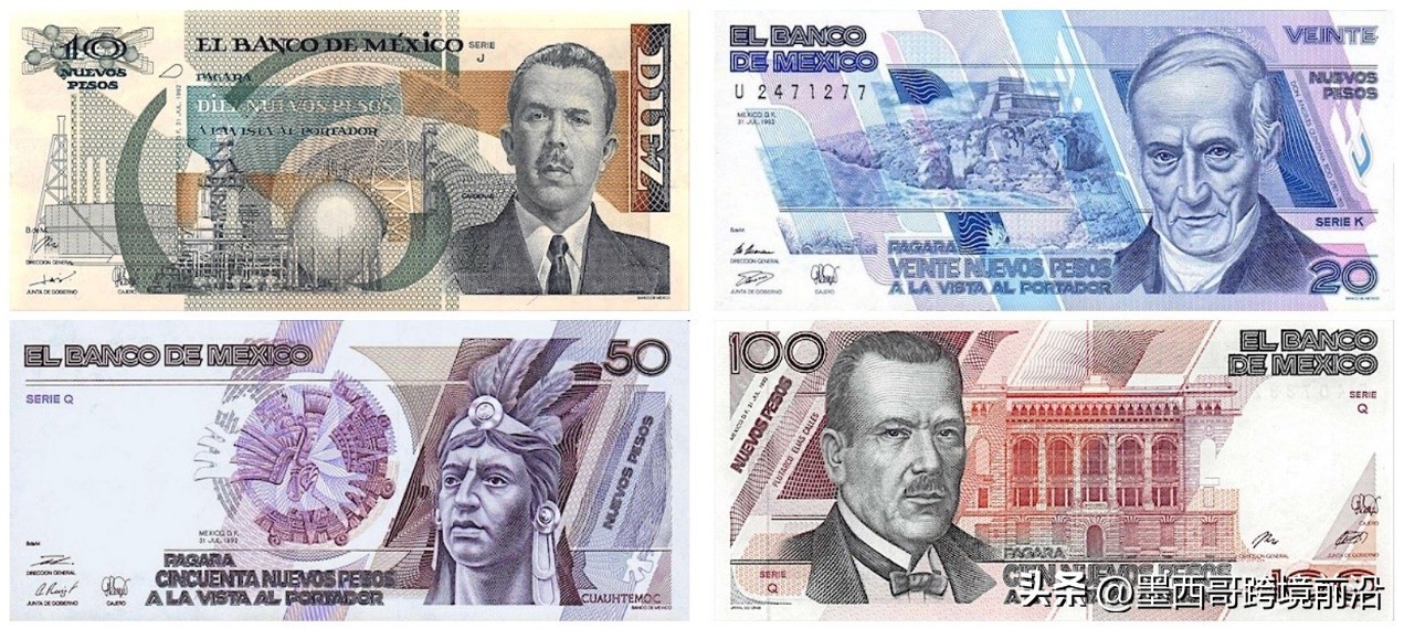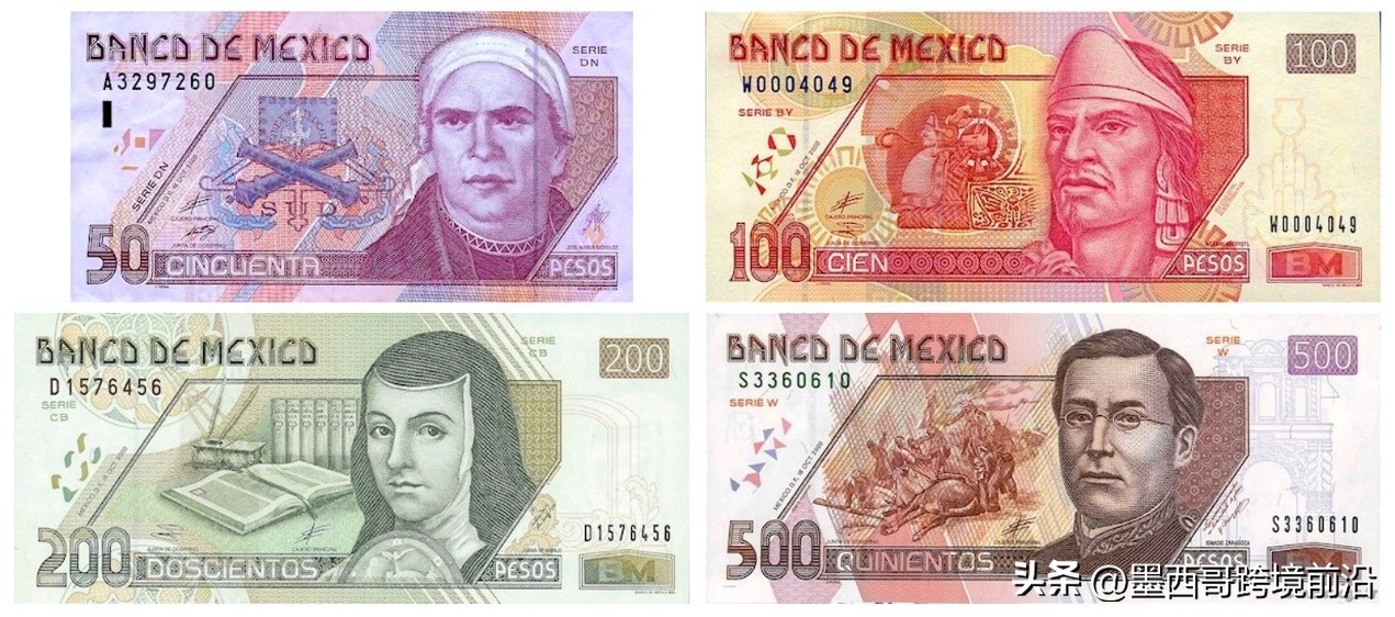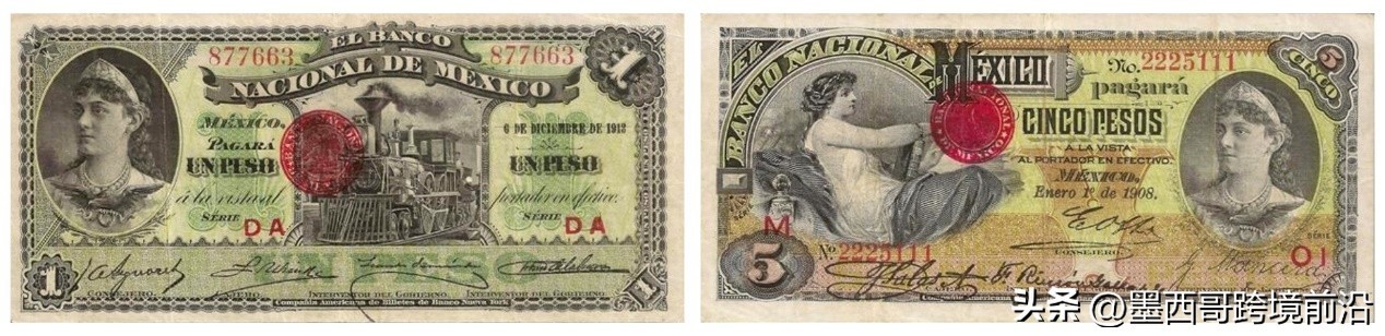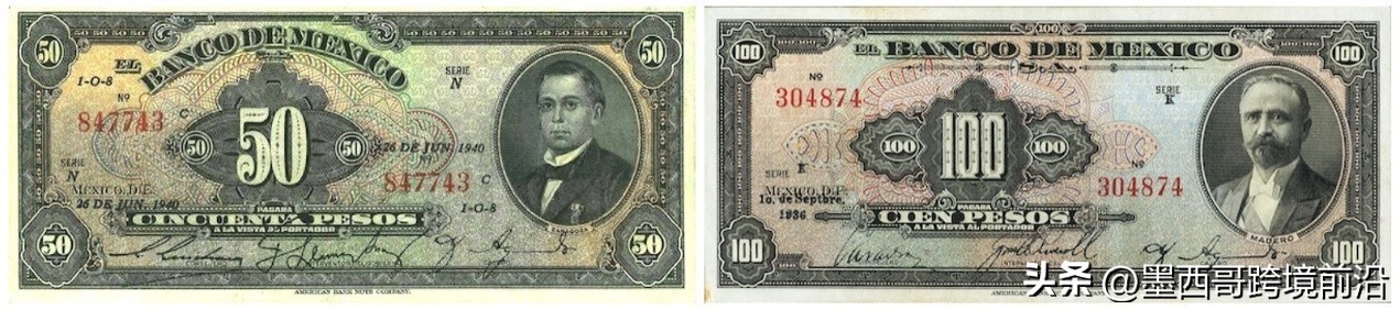 墨西哥央行的第 一批纸币上,50和100比索的面额采用了历史人物的形象设计,这是墨西哥央行发行的第一批具有历史人物形象的纸币。