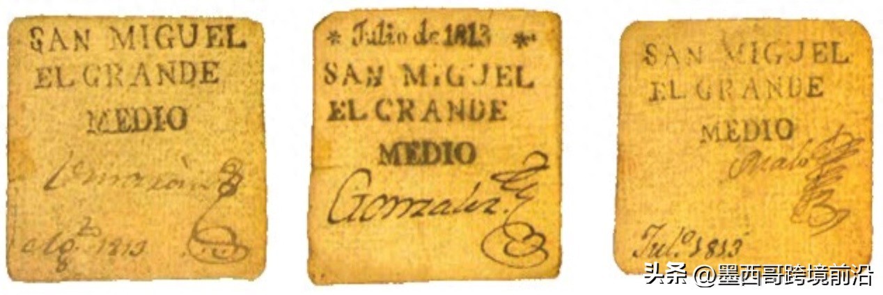 在1813年,奇特的半个真实的橙色卡纸硬币出现在瓜纳华托州圣米格尔镇,发行者不详。墨西哥纸币的另一个背景可以追溯到18世纪末,当时在前西班牙殖民地路易斯安那州发行了多种面额的纸币。