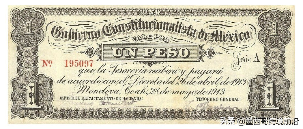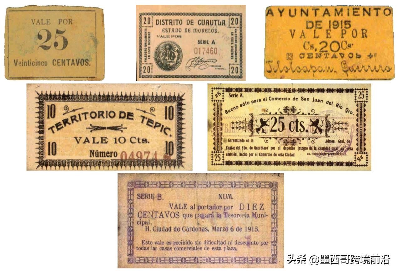 然而,货币短缺迫使市政当局、军事领导人、商人、矿工和地主发行必需品。因此,从1913年到1915年,必需货币再次在墨西哥出现:全国铸造了几种金属货币,但纸币的发行却倍增。首批发行这种货币的是文斯蒂亚诺·卡兰萨,宪法军首领和反对韦尔塔起义的领导人,他授权几位首领发行自己的纸币、代金券和卡片以筹集竞选资金。