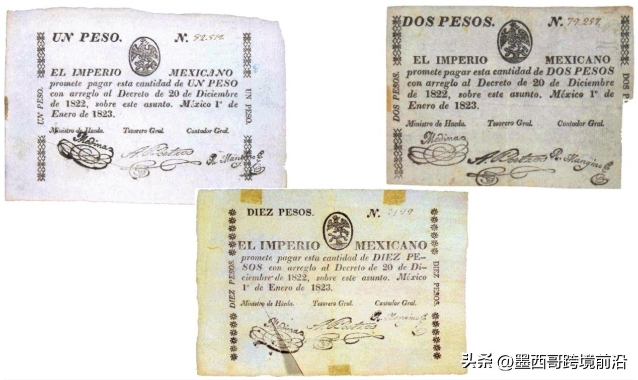 作为一项极端的手段,纸币被发行(1822年12月20日)。这些纸币是墨西哥的首次正式发行,也被认为是该国首批临时需求纸币。这些纸币是单面印刷的,印在一个几乎正方形的白色纸张上,上面印有“IMPERIO MEXICANO”(墨西哥帝国)的字样,面额为1、2和10比索。