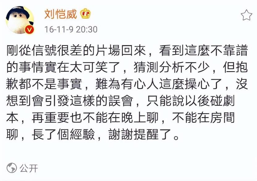 刘恺威发文称,他和王鸥只是在讨论剧本,并没有做其他的事情,是被有心人诬陷了。