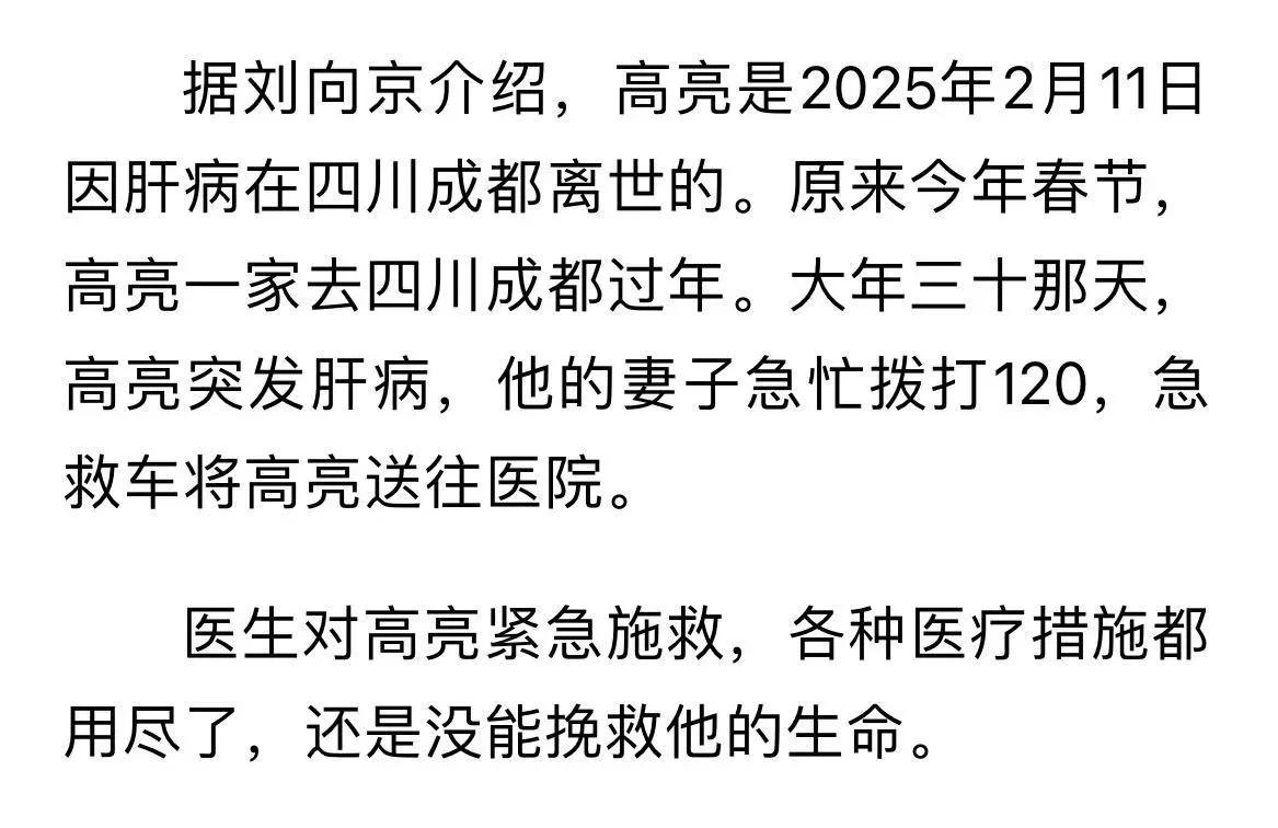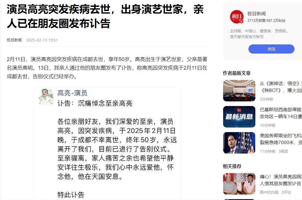 演员高亮突发疾病去世,出身演艺世家,亲人已在朋友圈发布讣告(极目新闻 2025-2-13)