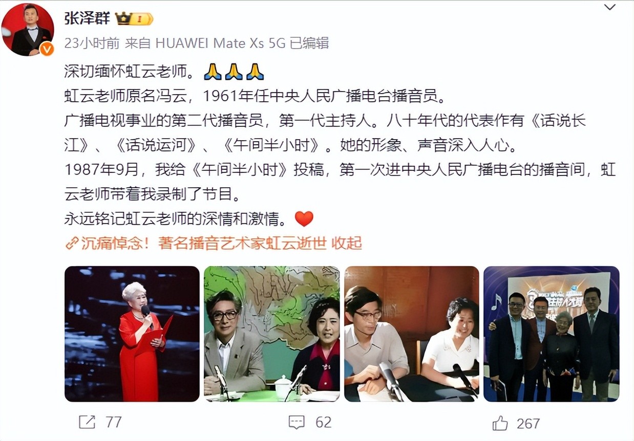 2月13日,虹云在北京逝世,享年81岁,主持人张泽群发文缅怀。