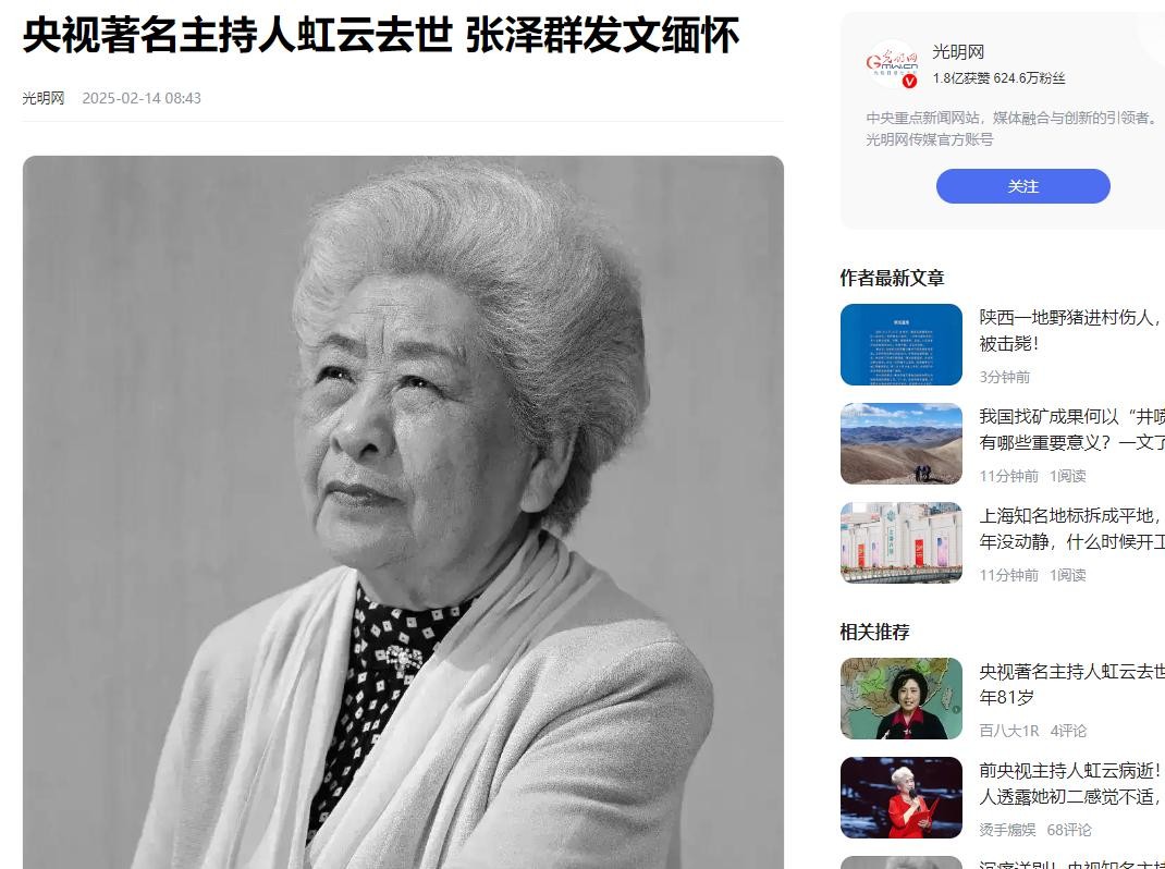央视著名主持人虹云去世 张泽群发文缅怀(光明网 2025-2-14)