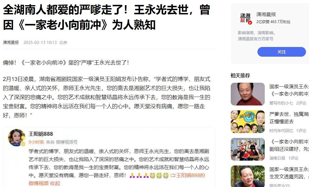 全湖南人都爱的严嗲走了!王永光去世,曾因《一家老小向前冲》为人熟知(潇湘晨报 2025-2-13)