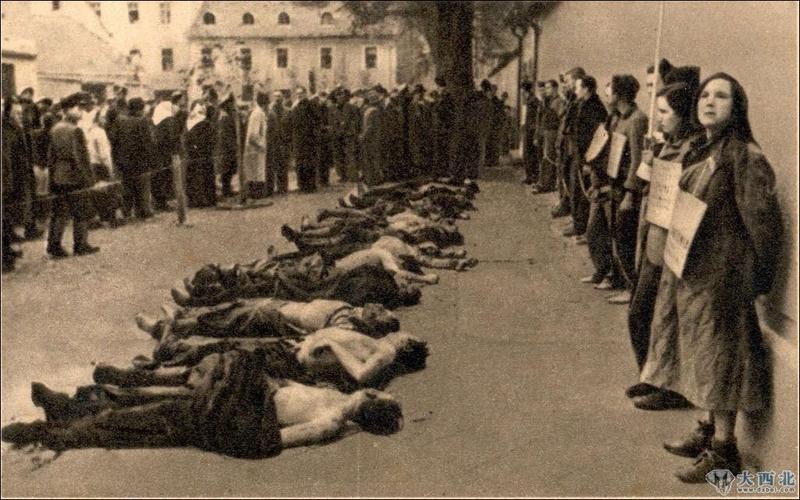 画面中,几名死者被排成一列,带下车来。他们的胸前悬挂着写有姓名和罪行的牌子,面色沉郁地站在路边。