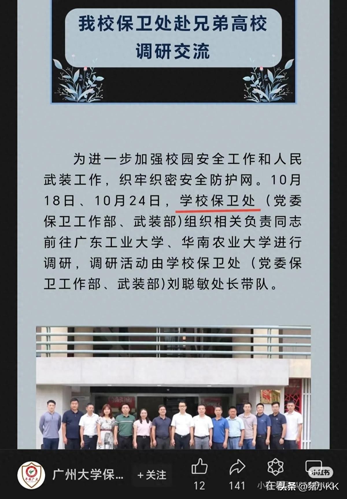 不少网友在广州大学保卫处的公众号上发现了何捷的身影。其中一篇信息报导了该校保卫处前往广东工业大学,华南农业大学进行调研交流的内容。