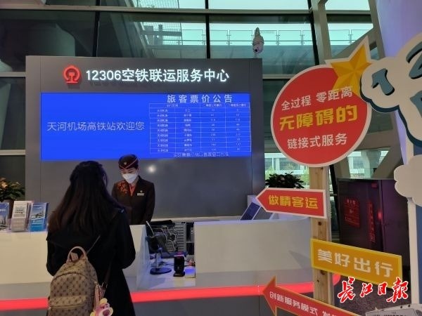 为了更好发挥纽带作用,去年3月,武铁在天河机场T3航站楼2楼8号门前设立并启用了12306空铁联运服务中心。机场旅客不用出航站楼,就能在这里购买火车票、退改签车票,查询航班、铁路列车正晚点信息。