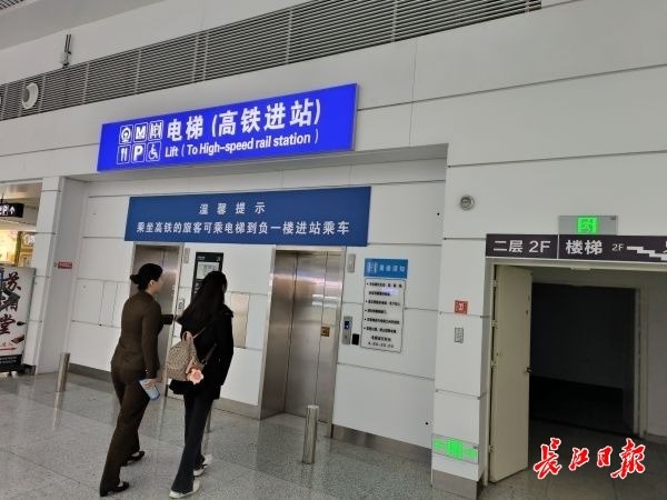 乘坐电梯下负一楼到达高铁站进站口。记者徐丹 摄