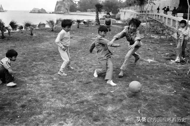 上世纪80年代末,在鼓浪屿海边草坪上踢足球的孩子们。照片中的这几个孩子也就七八岁的年纪,他们开心地在草坪上追逐的足球,尽情地享受童年的快乐。这群孩子如此热爱足球,希望他们能够踢出自我。