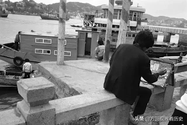 照片中的这位画家坐在码头的栏杆上,他的面前摆放着一块简易的画板,他正在专心致志地绘画。从照片中露出画板的一角可以看到,他绘的就是面前的这个小码头,码头上停泊着几艘归港的渔船,远处是大海和小山,这是多么令人向往的地方啊!难怪画家要到这里来写生。