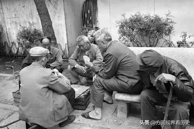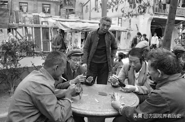 上世纪80年代鼓浪屿街边打牌的市民。照片中的这几位市民大概是五六十岁的样子,他们坐在一个石桌前打牌,旁边还有一位围观的大爷。