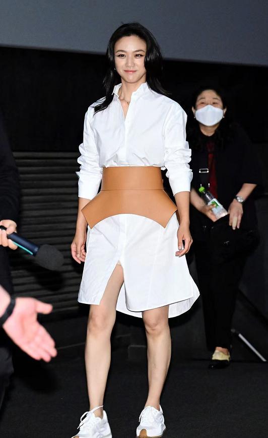 另外一场路演活动,汤唯选择了一件纯白色的衬衫裙亮相,从剪裁风格上来说,衬衫裙是打造简约优雅风的首选,经典的翻领正肩设计,可以很好的提升造型的干练感,而且也有利于修饰肩颈线条,更显挺拔。