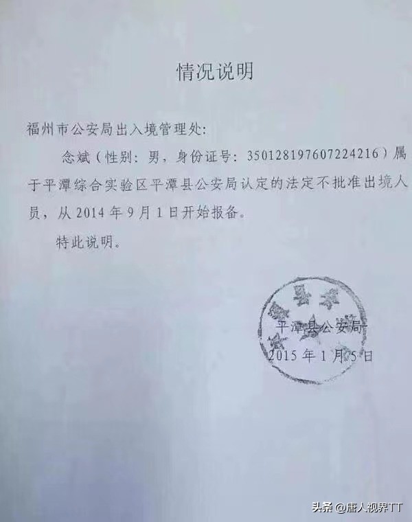 平潭县公安局出具的禁止念斌出境的情况说明书