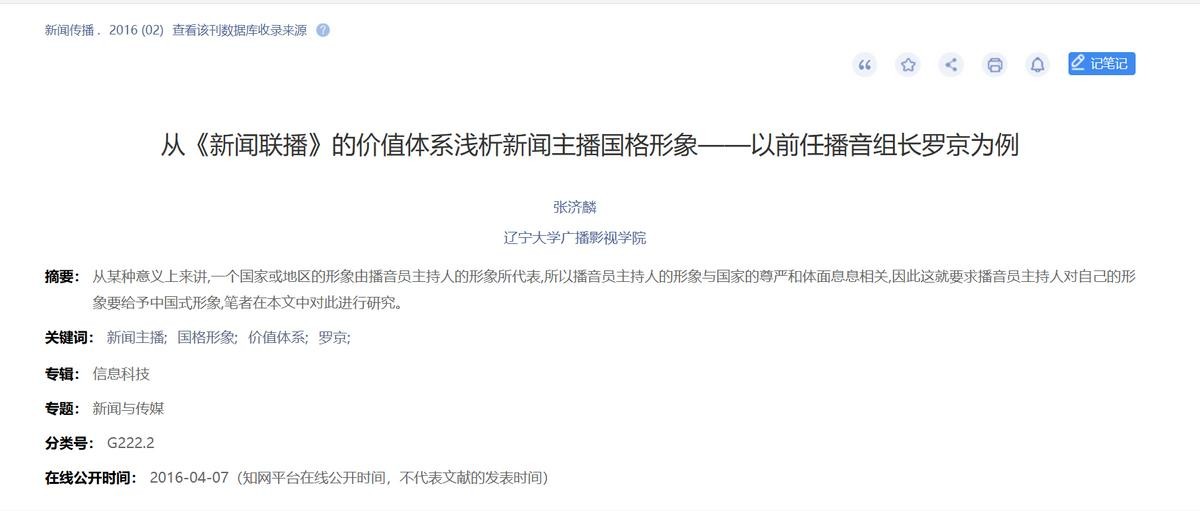 [2]张济麟.从《新闻联播》的价值体系浅析新闻主播国格形象——以前任播音组长罗京为例[J].新闻传播,2016,(02):27+29.