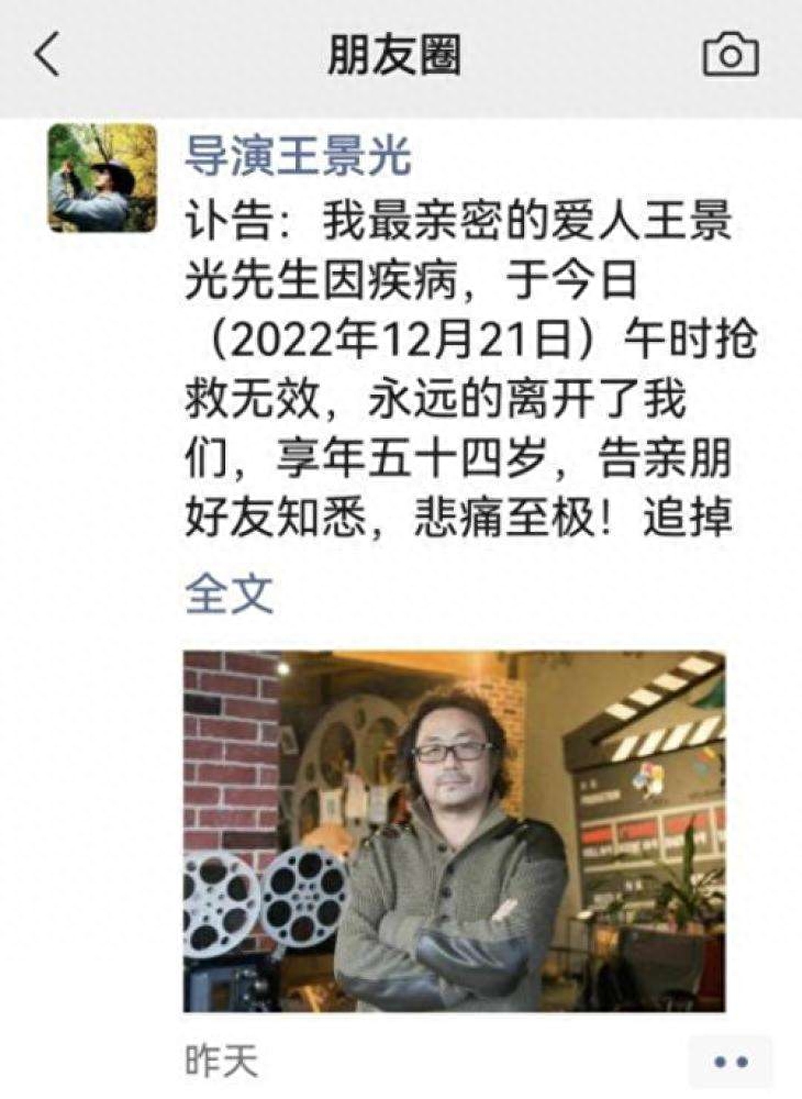王景光导演去世之后,王景光的妻子发出讣告,对王景光的去世感到痛心疾首,悲痛至极,痛哭流涕,让人怜惜。