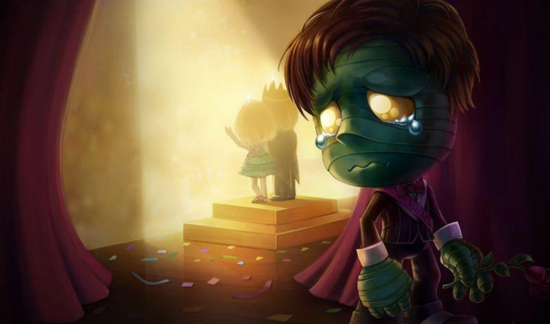 而第三个背景故事中,解释了阿木木为什么身材矮小,给他设定成了一个约德尔人,而他也是唯一一个当上了恕瑞玛帝王的约德尔人,可后来阿木木为了证明人性本善,就办成乞丐,希望得到约德尔人的帮助,但最后他被活活饿死了。拳头设计的这三个背景故事,每一个都把阿木木写死了,看来阿木木根本不是亲儿子,更像仇人家的孩子,设计多个背景故事,只为了多给他写死几次吧。而为了增加阿木木的苦情戏码,拳头公司还为阿木木加上了单恋安妮这个头衔。安妮有款皮肤是“舞会公主”,而阿木木则有个“我不是王子”,阿木木皮肤的原画里,可以看到安妮和一个王子在舞台上,但阿木木却在幕后哭泣,我不是王子,就是阿木木此刻的心声。
