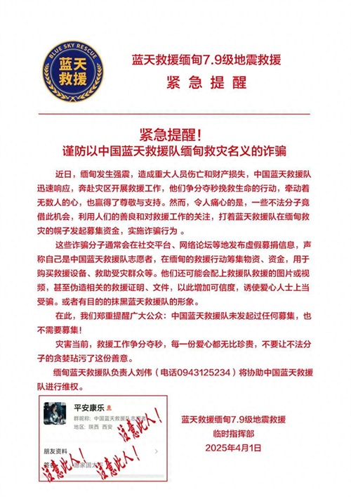 4月1日,落款为蓝天救援缅甸7.9级地震救援临时指挥部的一份提醒声明称:“缅甸强震救灾之际,一些不法分子竟借此机会,利用人们的善良和对救援工作的关注,打着蓝天救援队在缅甸救灾的幌子发起募集资金,实施诈骗行为。”