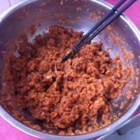3. 胡萝卜剁好,葱姜剁成沫,加入剁好的羊肉,再加入花椒粉,盐,味精,油,香油。香喷喷的肉馅就和好啦!