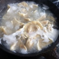 6. 锅里加水,水开下入饺子,挨着锅边用勺子把饺子推起来,开了以后打三回凉水,再煮开就熟啦~