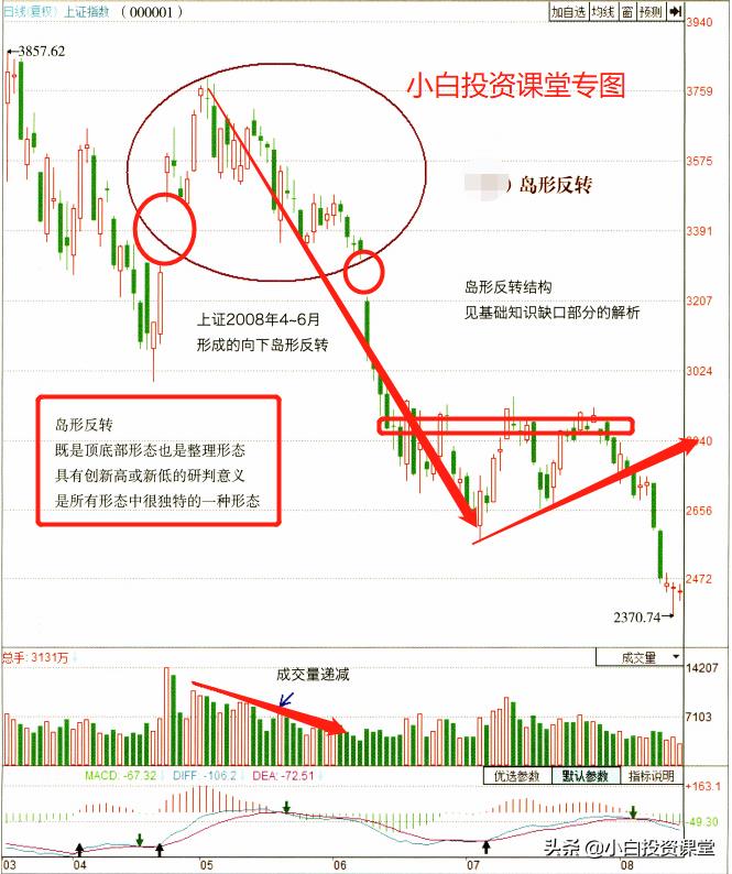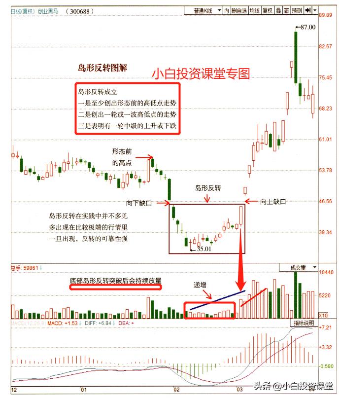 3、通常岛形如果在高位,岛形中成交量从左到右是渐减的。而底部成交量一般是渐增的。