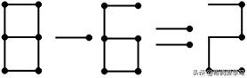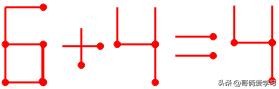 1.1 加号变减号:这是最能够在第一时间想到的方法。我们拿走1根火柴将加法变为减法,等式变成6-4=4。然后思考拿走的1根火柴可以加到哪一个数字上,4加1根火柴不能变为任何数字(注意:9不行,需要2根火柴才可以),所以这根火柴只能加在6上,那就只能变为8,验证等式:8-4=4,等式成立。(或者这么想:不考虑4,直接观察6,加1根火柴,只能变为8,等式正好成立,得解)