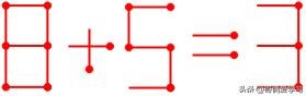 8变为3时:需要拿走8的2根火柴。与上面同理,右边的3只能变大为8或9或13。若3变为8,5刚好不用移动火柴棒且等式成立,答案为:3+5=8;若3变为9,则需要5在增加1根火柴棒的情况下变为6,很明显,增加1根火柴棒到5左下即可,等式成立,答案为:3+6=9;若3变为13,5只能保持不变,但是等式不成立。