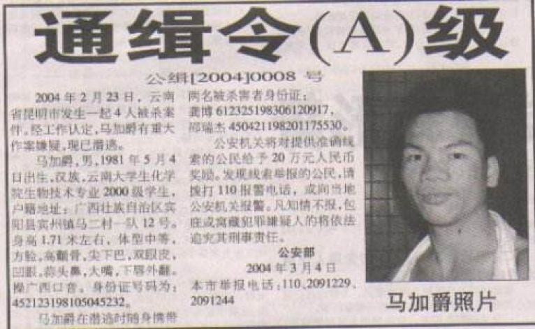 2004年2月13日至15日,云南大学生化学院生物技术专业2000级学生马加爵,寒假在校,一意孤行,持石工锤残害四名同窗,其中三名是他的铁哥们,一名是他的同学。惨案发生后,他慌不择路,逃离昆明,流落三亚,以捡破烂为生。一个月后,被当地群众识破并报案,终于落网。同年6月17日,被执行死刑。