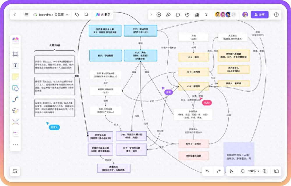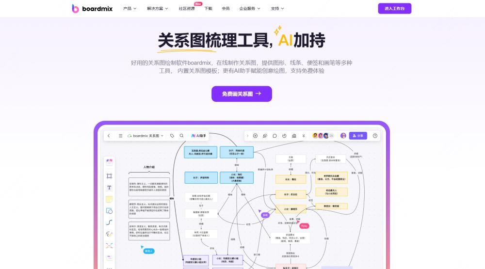 boardmix是一款功能强大的在线关系图制作软件,基于白板进行绘图,提供无限画布和丰富的绘制工具,同时它还嵌入了当下流行的AI智能助手——boardmix AI,支持AI问答、AI生图、AI总结、AI翻译、AI生成可视化模板等,AI加持,赋能创意绘图!