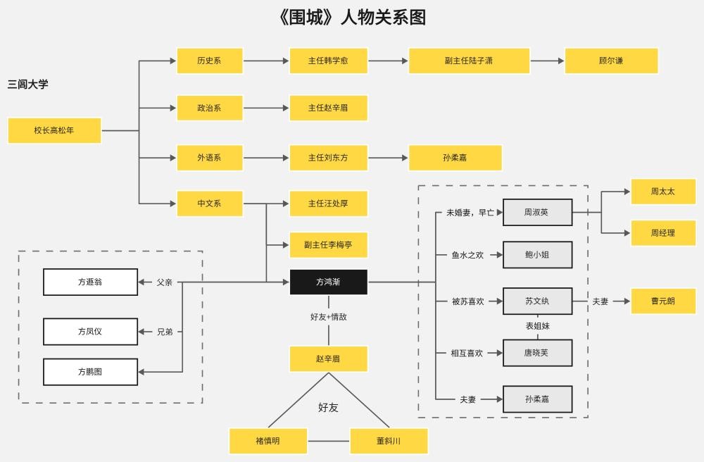 《围城》人物关系图模板是对钱钟书经典小说中人物关系的深度解析。这张图谱揭示了主人公与周围人物之间的情感纠葛和社会关系,帮助读者理解小说中的人物如何在20世纪30年代的中国社会中挣扎与追求。