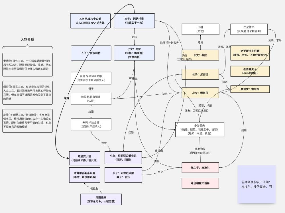 《战争与和平》人物关系图模板是对列夫·托尔斯泰史诗巨作中错综复杂的人物网络的可视化呈现。从贵族到农民,从战场到舞会,这张图谱帮助读者梳理出小说中数百个角色之间的联系,理解他们在拿破仑战争背景下的生活和命运。