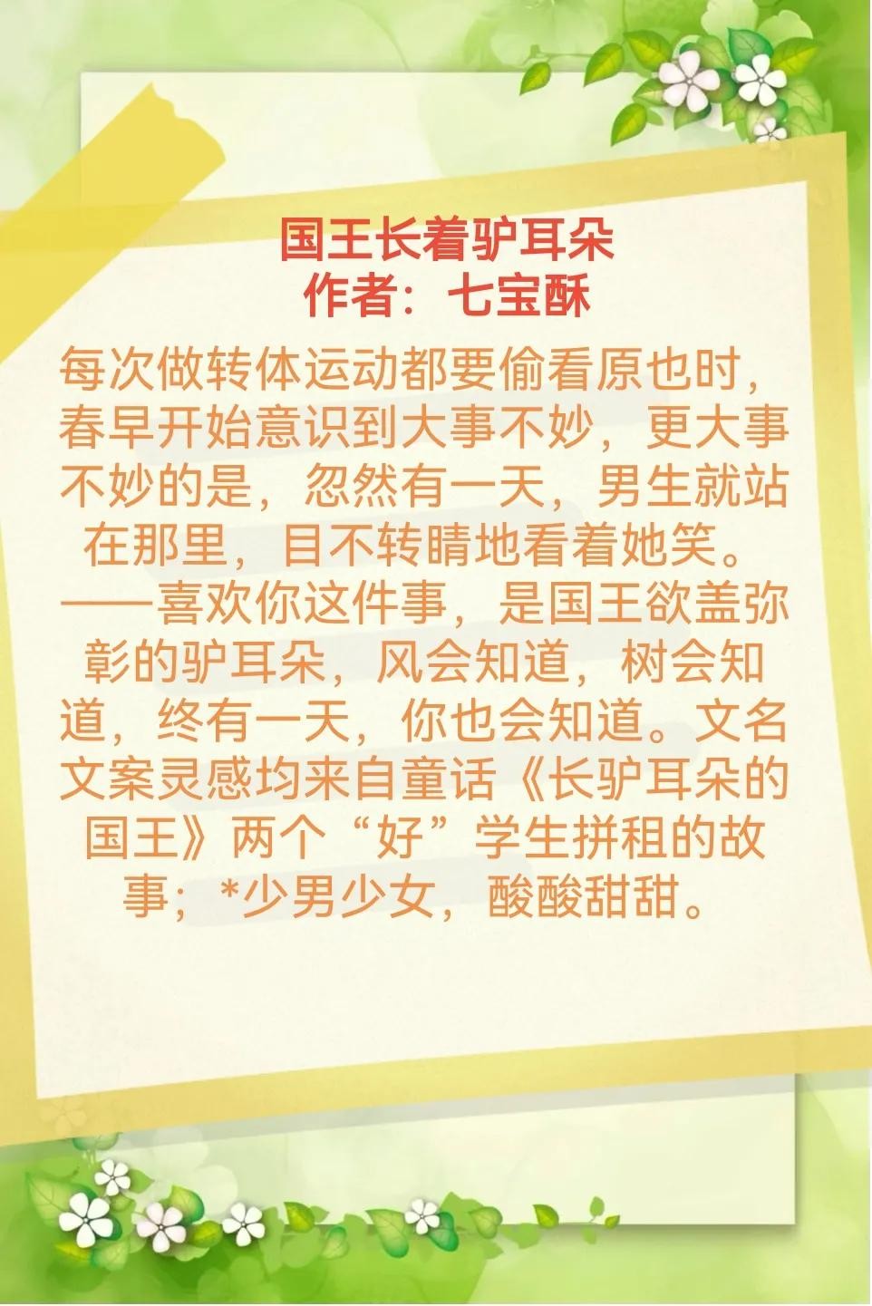 小说的文案灵感来源于童话《长驴耳朵的国王》,通过这个童话的隐喻,展现了主人公们内心深处的情感和挣扎。两人的关系从最初的陌生到后来的相互理解、支持,再到最后的相互表白,整个过程充满了甜蜜和温馨。