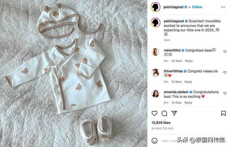 2月15日,泰国女星Pat通过个人社交账号发文分享怀孕的好消息,晒出一张婴儿服饰,配文称在2023年迎来他们的小宝贝,她感觉非常激动。众多圈内好友及粉丝前往送祝福。