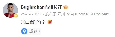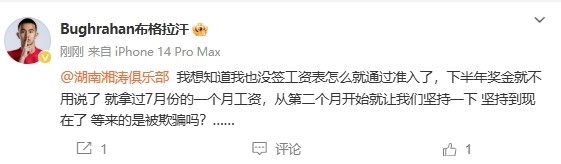 在湖南湘涛宣布解散之后,布格拉汗表示,“又白踢半年?”网友点评,“这个又字很心酸”。