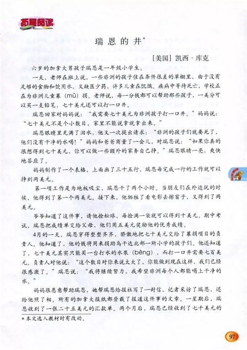 《瑞恩的井》作者是凯西·库克,选入教材。本文通过写加拿大男孩瑞恩为了让非洲的孩子们喝上干净的水,通过自己的劳动达成愿望,并产生巨大影响的故事,表现了瑞恩真诚无私的美好心理,说明了真诚无私的爱是没有国界的。