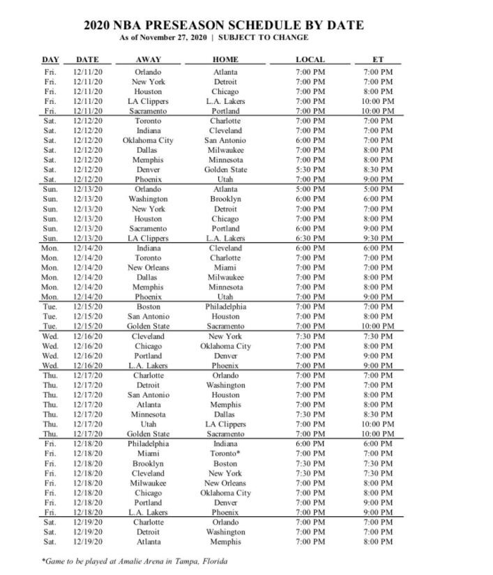 NBA公布了2020-21赛季季前赛赛程,将从北京时间12月12日开打,12月20日结束。