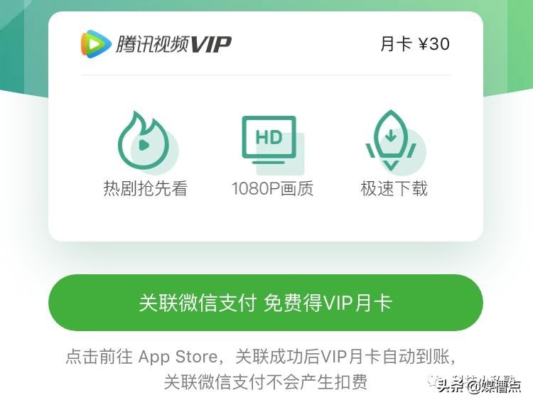 另外,这次的活动完全是官方推出的,所以不用担心,在App Store 绑定微信支付中,无需消费,也不需要产生任何费用,即可免费开通一个月的腾讯视频VIP。