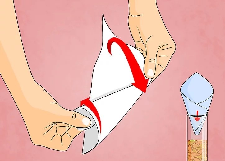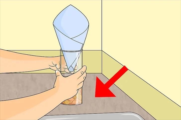 3、将一张纸卷成漏斗状,放进瓶子里。漏斗有个小洞让果蝇飞进瓶子,然而不够聪明的它们却怎么也飞不出来。用胶带把漏斗粘牢,让它保持形状。将漏斗放进瓶口。确保窄口朝下,并和诱饵保持一段距离(不要碰到诱饵)。