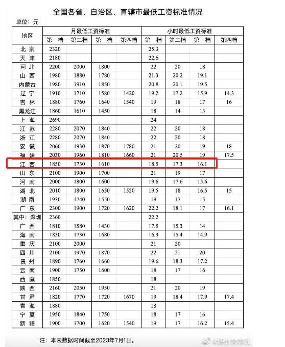 据人社部官网7月1日公布的全国各省、自治区、直辖市最低工资标准情况,江西月最低工资标准分为三档,分别为1850元、1730元和1610元;小时最低工资标准分别为18.5元、17.3元和16.1元。