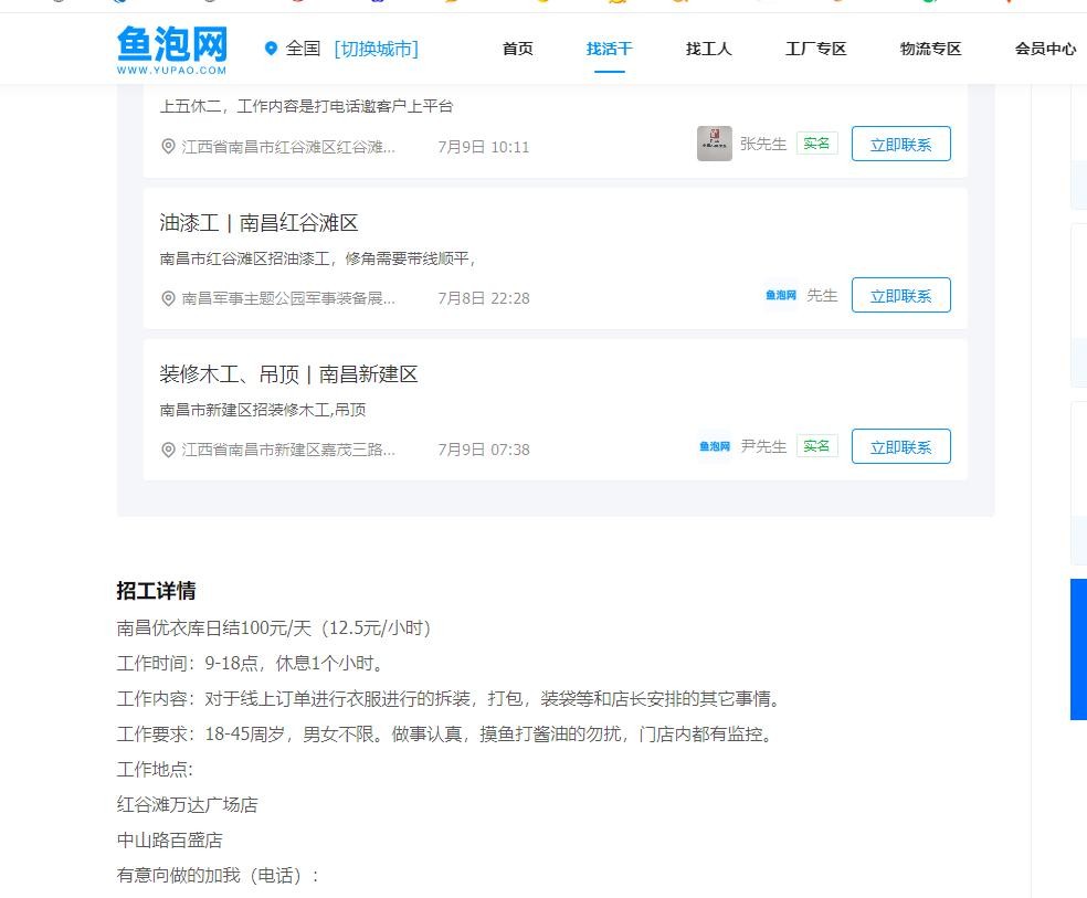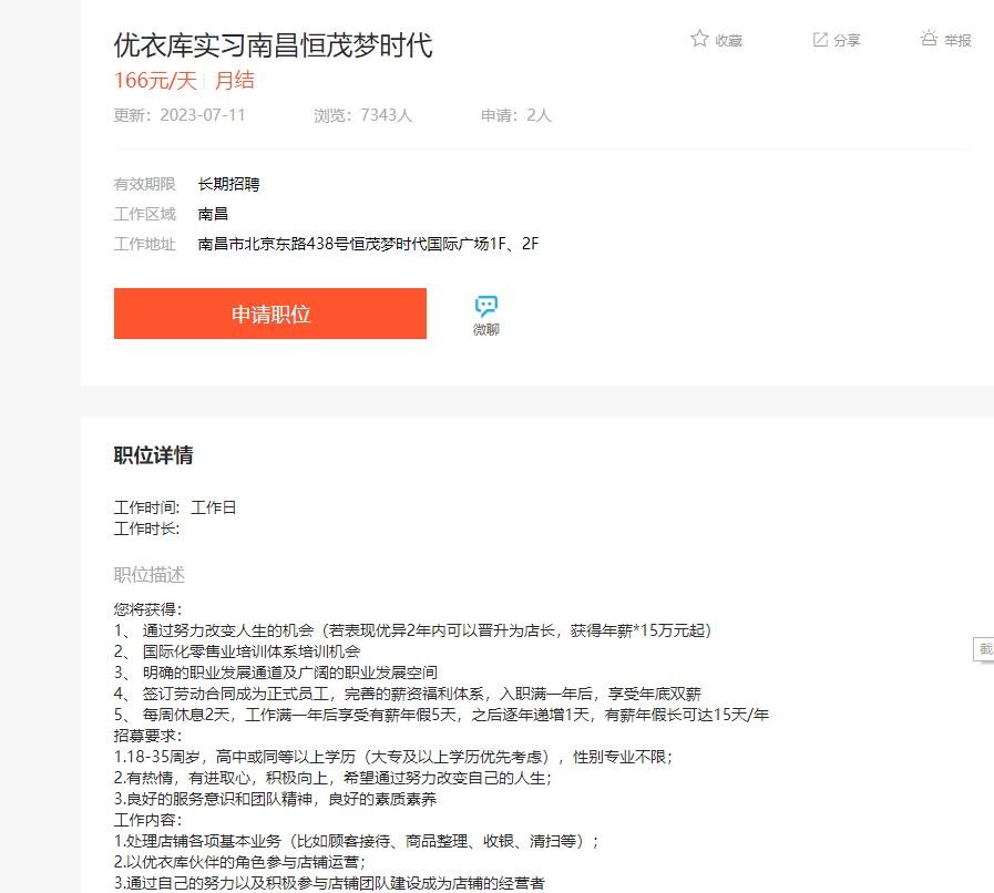 赣商新闻在网上检索“优衣库兼职”相关信息发现,以南昌为例,优衣库兼职薪资待遇从时薪12.5元/小时到166元/天不等。