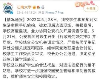 6月14日,江苏无锡的江南大学发布情况通报,称该校对一名到女生浴室用手机偷拍的学生给予开除学籍处分。