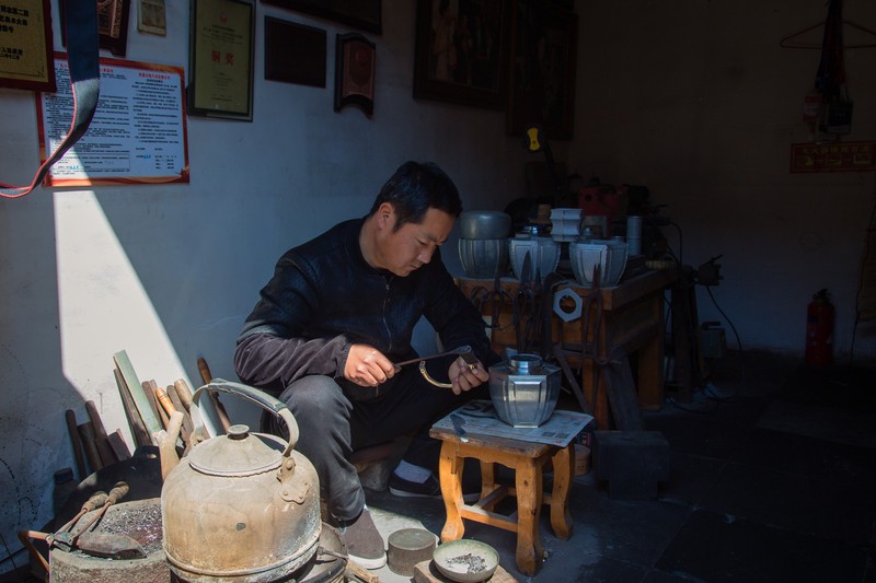 金东门老街的店铺也很多,而且都是一些老行当,如铁匠铺,桐油铁锅,锡器制作等等,静静地在阳光下看老师傅制作锡盘,造型格外别致,就像是一朵盛开的花朵,在现代社会中锡器已经非常少见了。老街的美食小吃有好几家,看似简陋却非常美味地道。如果在城市待久了,你一定会喜欢这里。