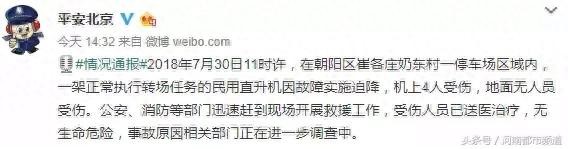 据@平安北京 通报,2018年7月30日11时许,在朝阳区崔各庄奶东村一停车场区域内,一架正常执行转场任务的民用直升机因故障实施迫降,机上4人受伤,地面无人员受伤。