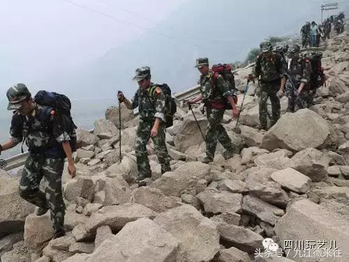 解放军背着食品和药品步行前往映秀镇
