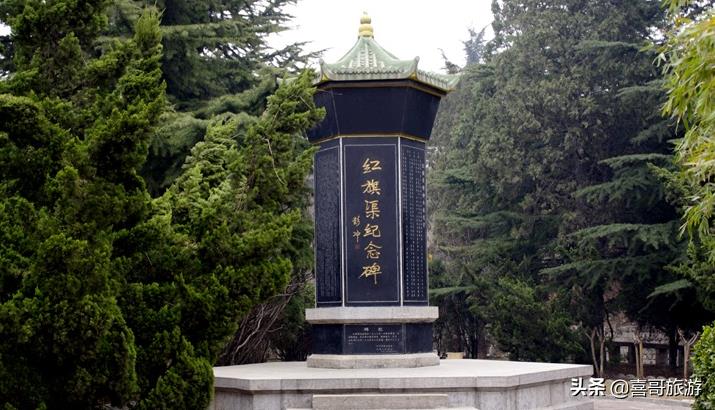 红旗渠纪念碑,是1990 年4 月5 日,红旗渠通水25 周年之际所建。纪念碑通高 2.2 米 ,共六棱,每棱面宽 0.74 米 。碑帽为仿古式屋檐护顶。