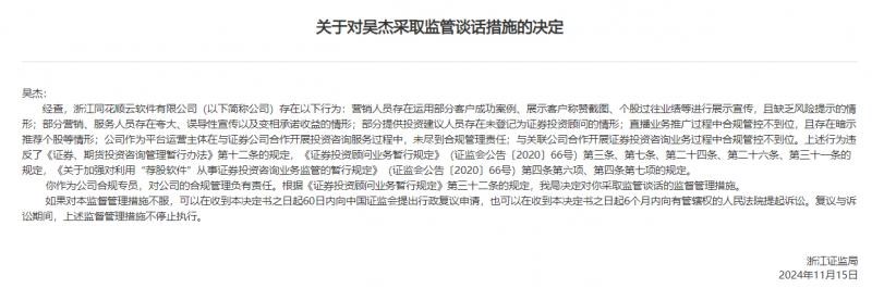 浙江证监局称,经查,同花顺云软件公司存在以下行为:营销人员存在运用部分客户成功案例、展示客户称赞截图、个股过往业绩等进行展示宣传,且缺乏风险提示的情形;部分营销、服务人员存在夸大、误导性宣传以及变相承诺收益的情形;部分提供投资建议人员存在未登记为证券投资顾问的情形;直播业务推广过程中合规管控不到位,且存在暗示推荐个股等情形;公司作为平台运营主体在与证券公司合作开展投资咨询服务过程中,未尽到合规管理责任;与关联公司合作开展证券投资咨询业务过程中合规管控不到位。