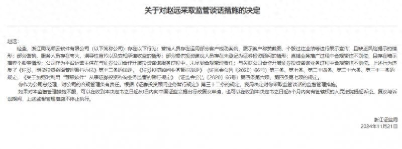 浙江证监局25日公告,浙江同花顺云软件有限公司(下称:同花顺云软件公司)总经理赵远、合规专员吴杰被监管谈话。