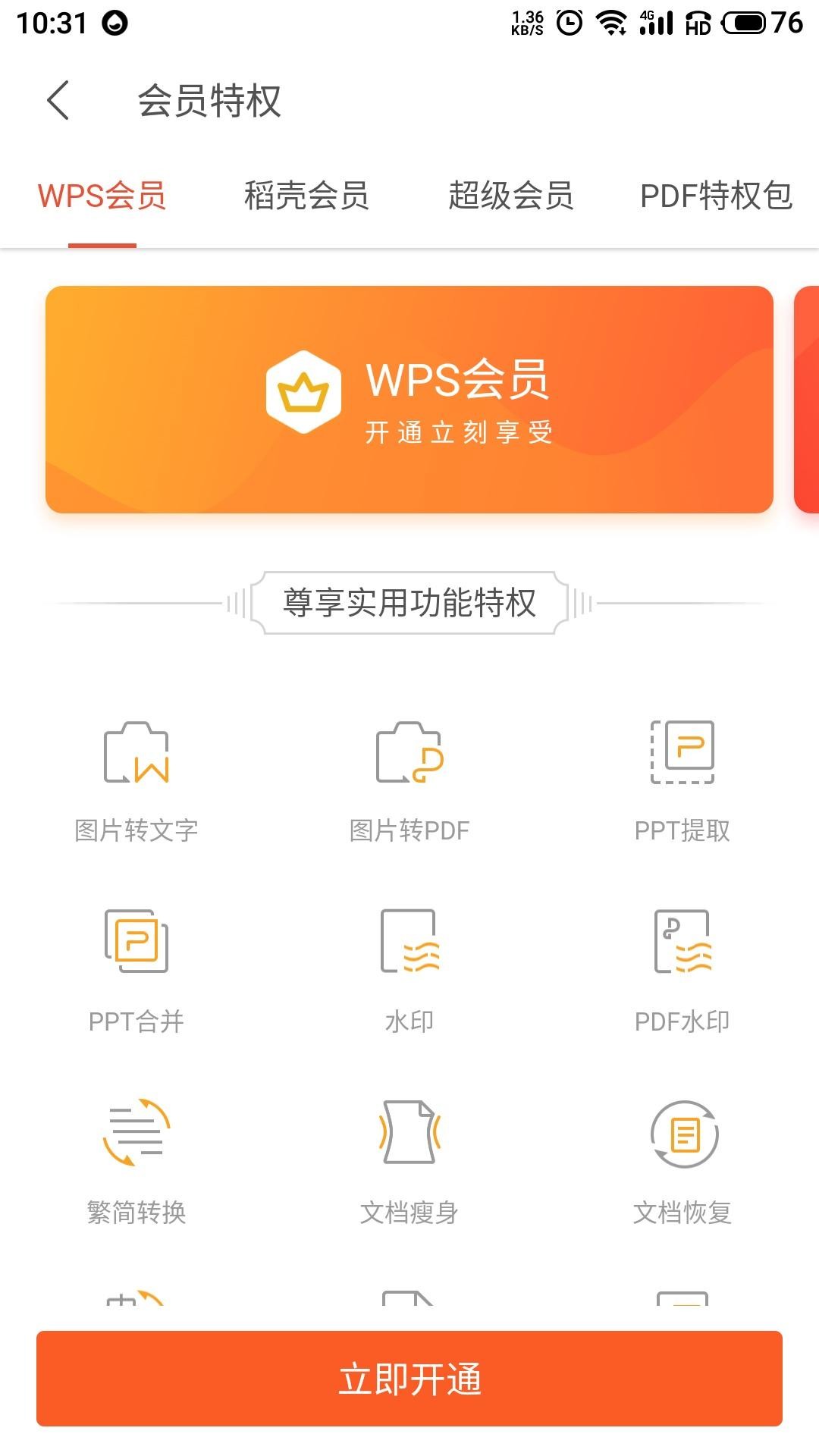 WPS Office软件的会员主要分为三种,第一种是WPS会员,它主要的特权有图片转文字,图片转PDF,PPT提取,PPT合并,PDF水印,文件瘦身,文档恢复等,大家可以根据自身需求选择。